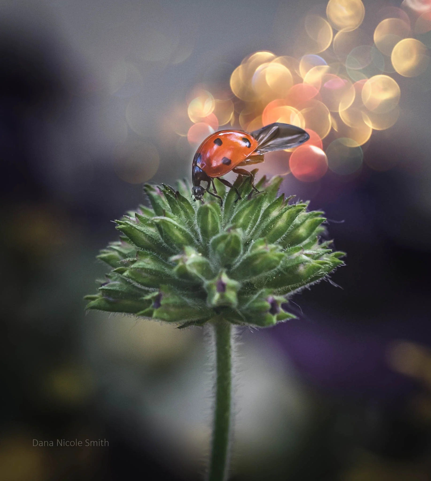 Close-up of a ladybug on green plant, with blurred bokeh light background.