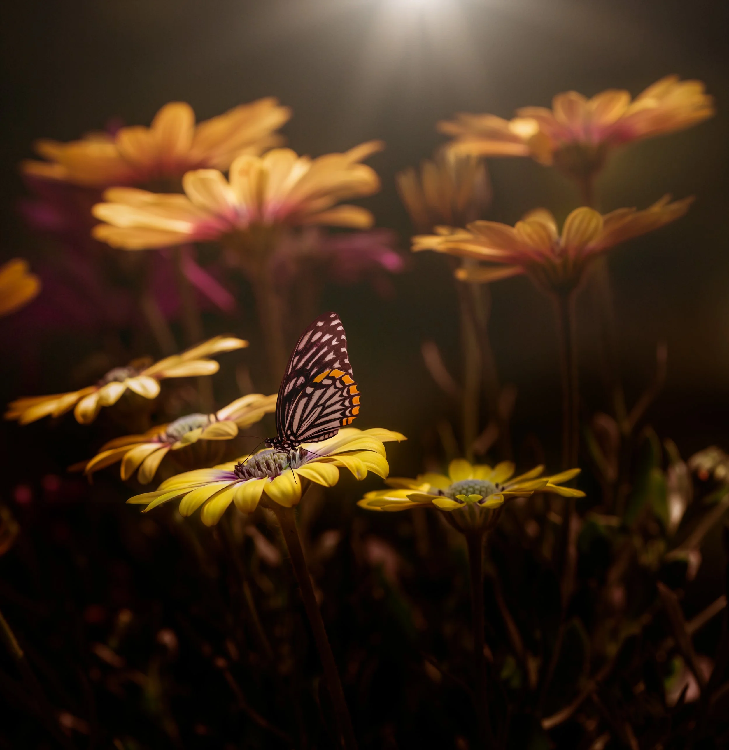 A butterfly perched on a yellow flower amidst a cluster of similar flowers in a dimly lit setting.
