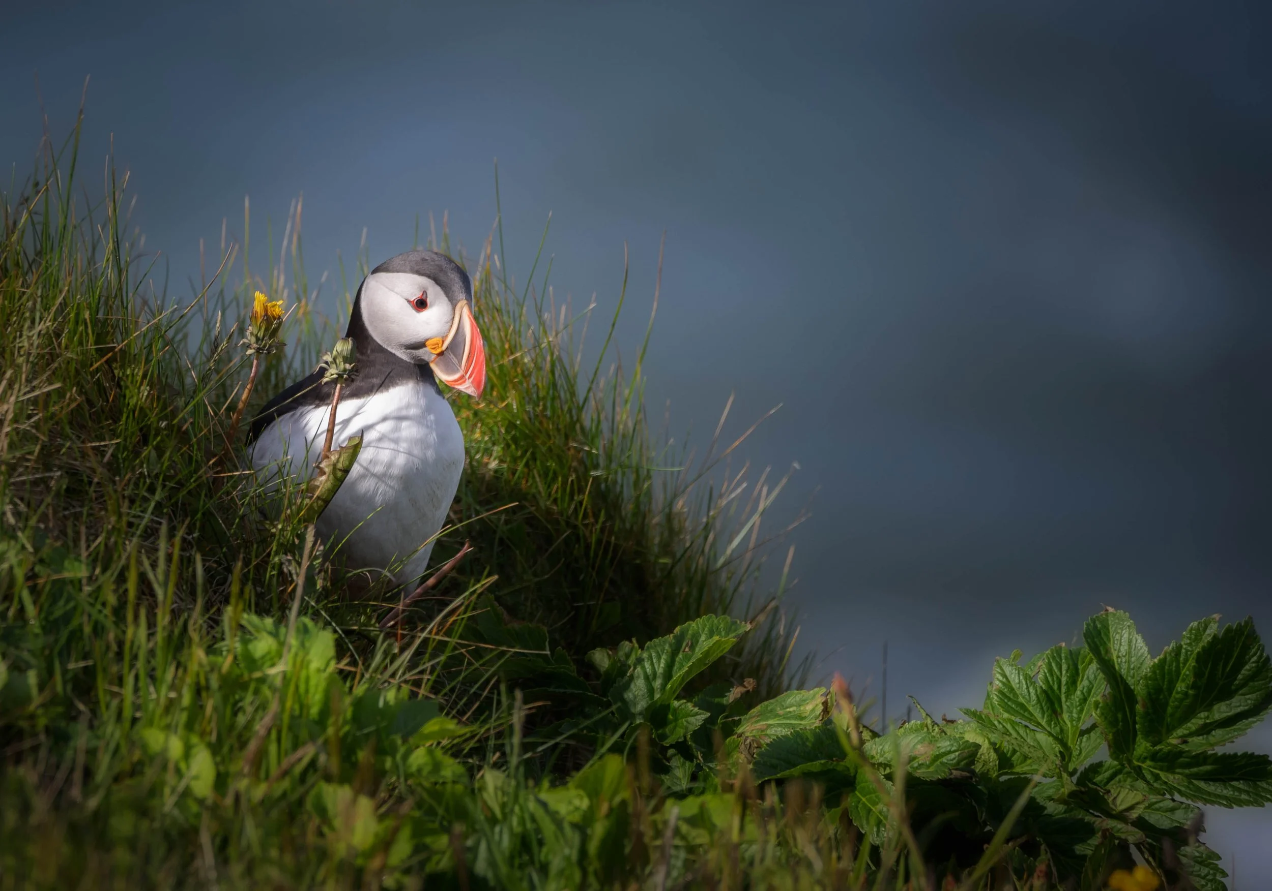 A puffin bird standing on a grassy hillside near the water with green plants and yellow flowers around it. View fullsize