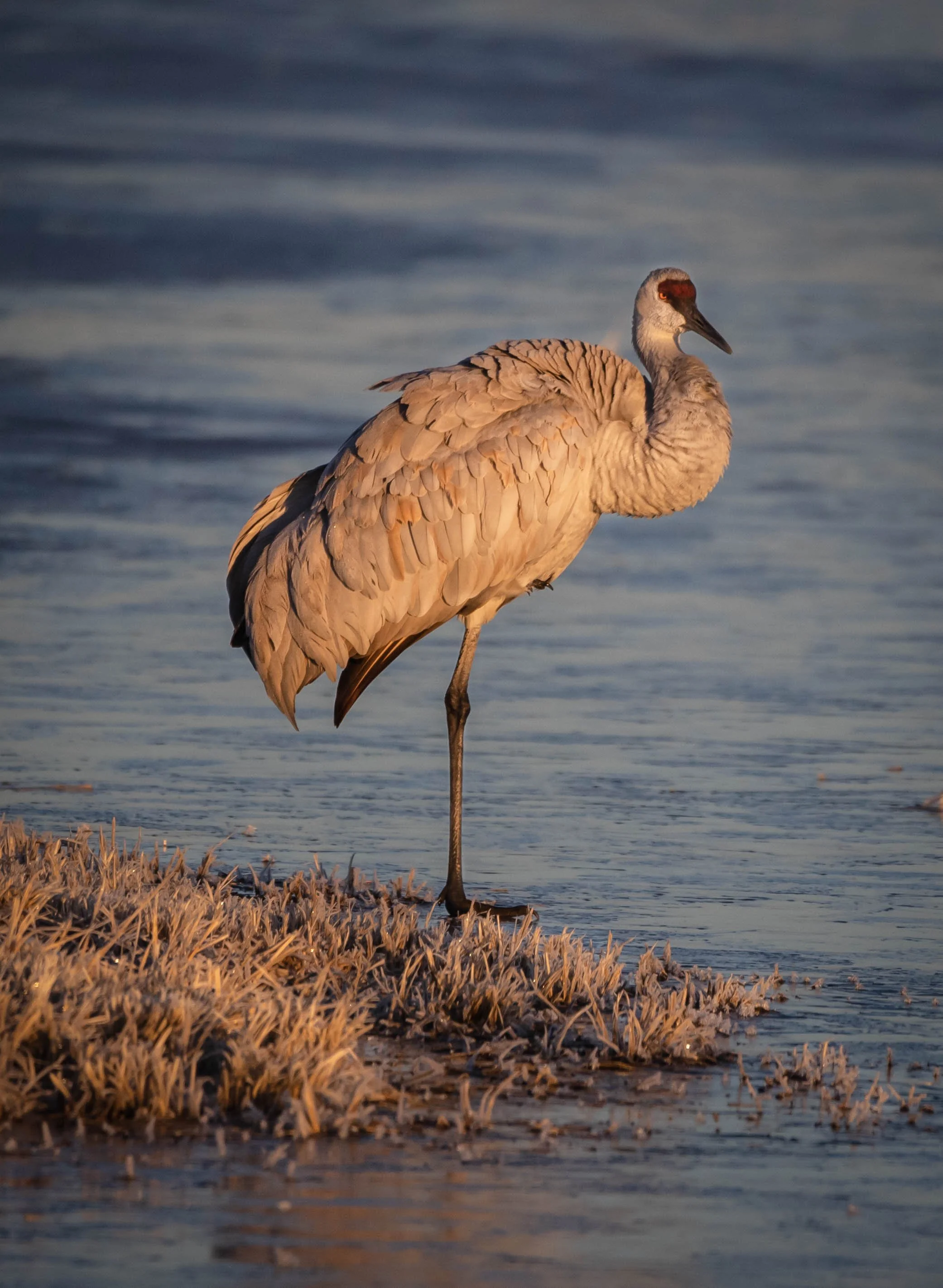 A sandhill crane standing on one leg near a body of water, with dry grass in the foreground and rippling water in the background. View fullsize