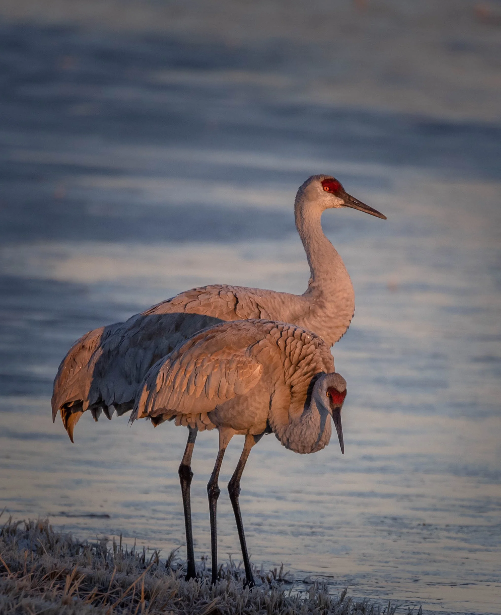 A pair of sandhill cranes standing by the water's edge, one with its head downward, the other with its head upright, during sunset. View fullsize